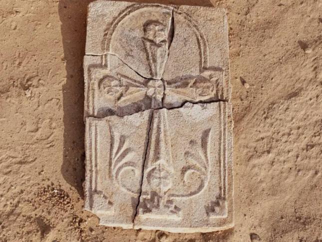 Haçta, Hıristiyanların İsa'nın çarmıha gerildiği yer olduğuna inandığı Golgota'yı simgeleyen basamaklı bir piramit ve tabanından filizlenen yapraklar görülüyor