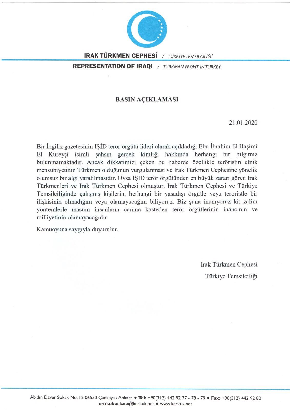 Türkmen Cephesi'nin konuyla ilgili yaptığı resmi açıklamayı da aşağıda ekliyorum: