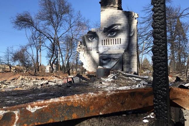 Yangın kalıntıları arasında eşyalarını aramaya devam edenler bir yana, Shane Grammer adlı duvar resim sanatçısı, küllerin arasında kaybolan yıkıntıları sanat eserine dönüştürdü.