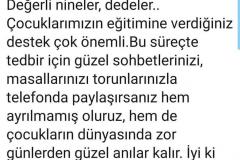 Değerli nineler, dedeler... Çocuklarımızın eğitimine verdiğiniz destek çok önemli. Bu süreçte tedbir için güzel sohbetlerinizi, masallarınızı torunlarınızla telefonda paylaşırsanız hem ayrılmamış oluruz hem de çocukların dünyasında zor günlerden güzel anılar kalır. İyi ki varsınız.