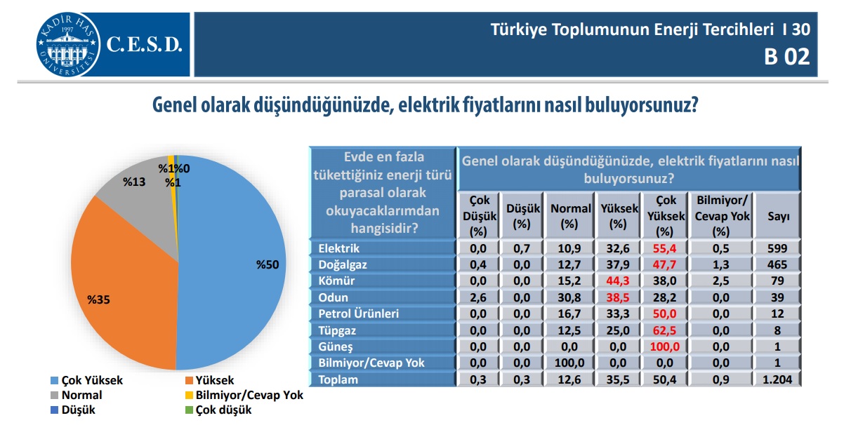 Katılımcıların yüzde 55,4'ünün elektrik fiyatlarını çok yüksek bulduğu görüldü. Fiyatı en yüksek ikinci enerji türü ise yüzde 47,2'yle doğalgaz oldu.
