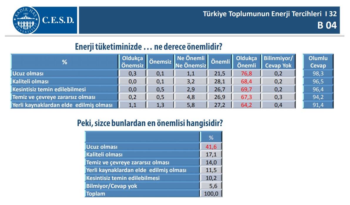 "Peki, size enerji tüketiminde bunlardan en önemlisi hangisidir?" sorusuna verilen yanıtlarda ise yüzde 41,6'lık oyla enerji fiyalarında ucuzluk ilk sırada yer aldı.