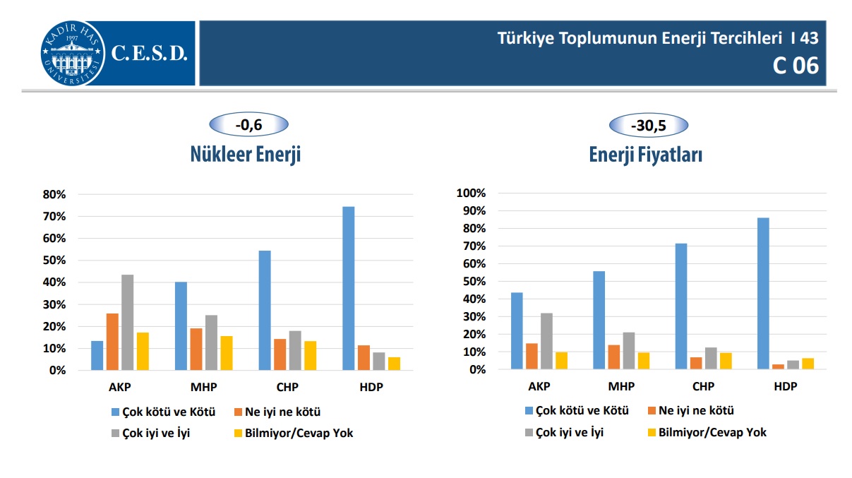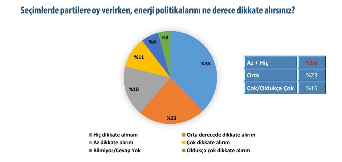 Anket, enerji politikalarının seçmen eğilimine etki etmediğini de ortaya koydu. "Oy verirken partinizin enerji politikalarını ne derece dikkate alırsınız" sorusuna az ve hiç yanıtı verenlerin oranı yüzde 56'yı buldu.
