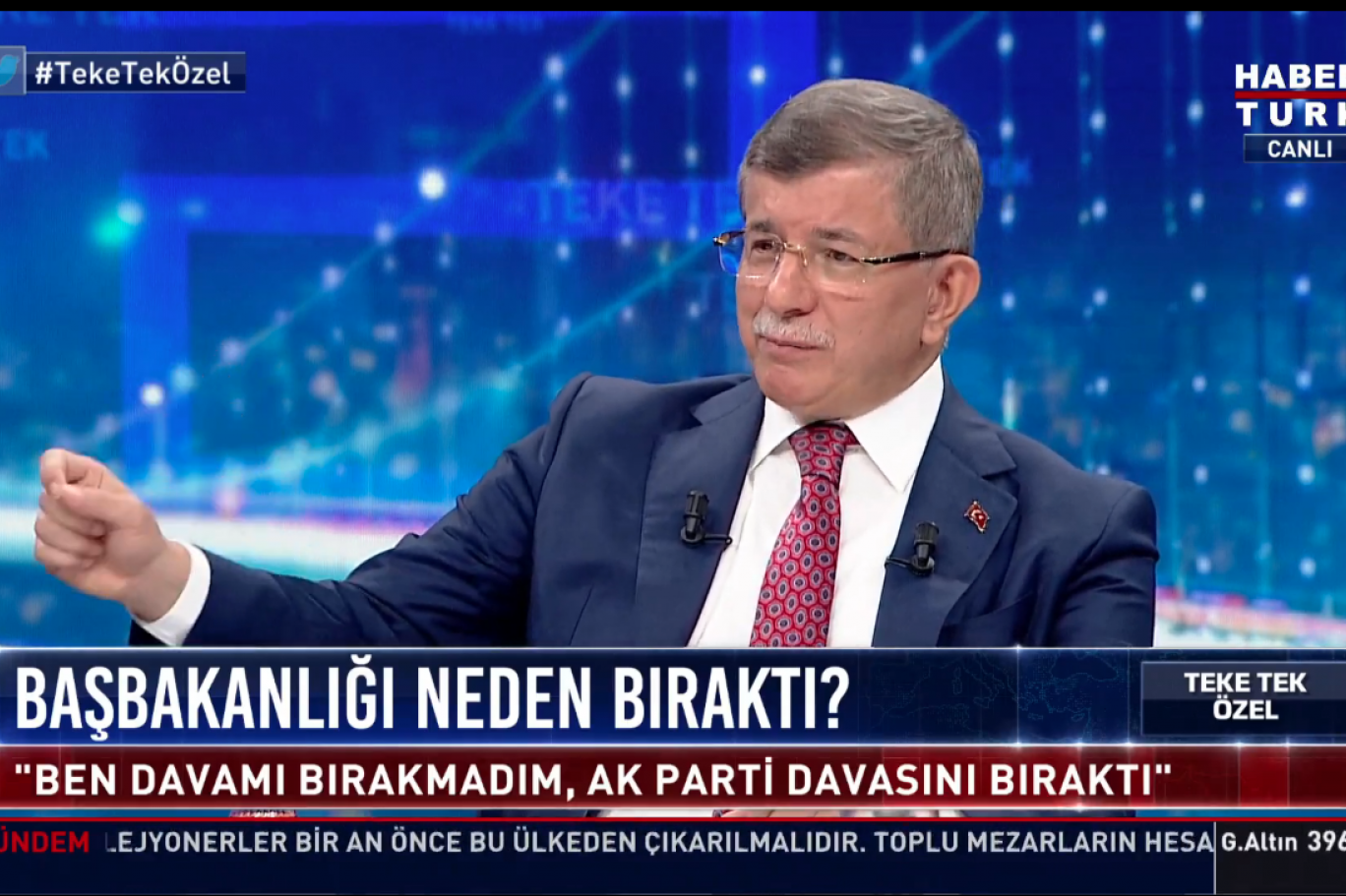 O dönem yaşadıklarına dair, “İlkelerimle koltuğum arasındaki uçurum gittikçe açılıyor” diyen Davutoğlu, HaberTürk’te Fatih Altaylı’nın sunduğu Teke Tek Özel programına konuk oldu.