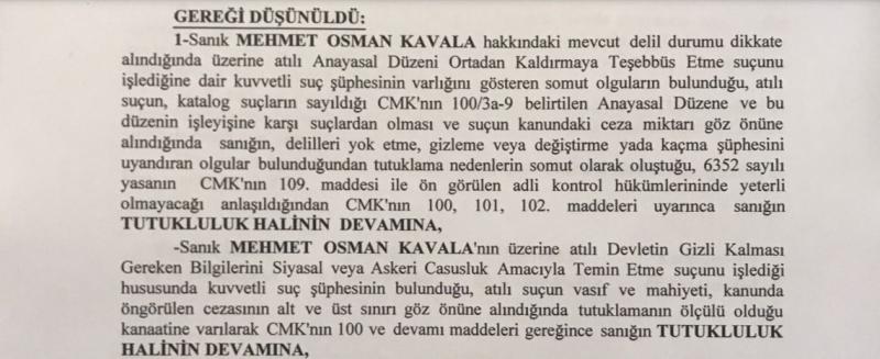 Tarafımızca anlaşılamayan bir diğer husus, İstanbul 36. Ağır Ceza Mahkemesinin bu yetersizlikte bir iddianameyi kabulünden ötedir. Zira Ağır Ceza Mahkemesi, bugün itibarı ile imza altına almış olduğu tensip zaptının 1. maddesinde Osman Kavala’nın “TCK 309. maddeden Tutukluluğunun Devamına” karar vermiştir, oysa ki Osman Kavala hakkında TCK 309. maddeden verilen bir tutuklama kararı bulunmamaktadır.