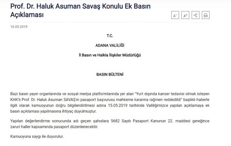 “Bazı basın yayın organlarında ve sosyal medya platformlarında yer alan “Yurt dışında kanser tedavisi olmak isteyen KHK'lı Prof. Dr. Haluk Asuman SAVAŞ'ın pasaport başvurusu mahkeme kararına rağmen reddedildi” başlıklı haberle ilgili olarak kamuoyunun doğru bilgilendirilmesi adına 15.05.2019 tarihinde Valiliğimizce yapılan açıklamaya ek basın açıklaması yapılmasına ihtiyaç duyulmuştur. Yapılan değerlendirme sonucunda adı geçen şahıslara 5682 Sayılı Pasaport Kanunun 22. maddesi gereğince zaruri haller kapsamında pasaport düzenlenecektir.”