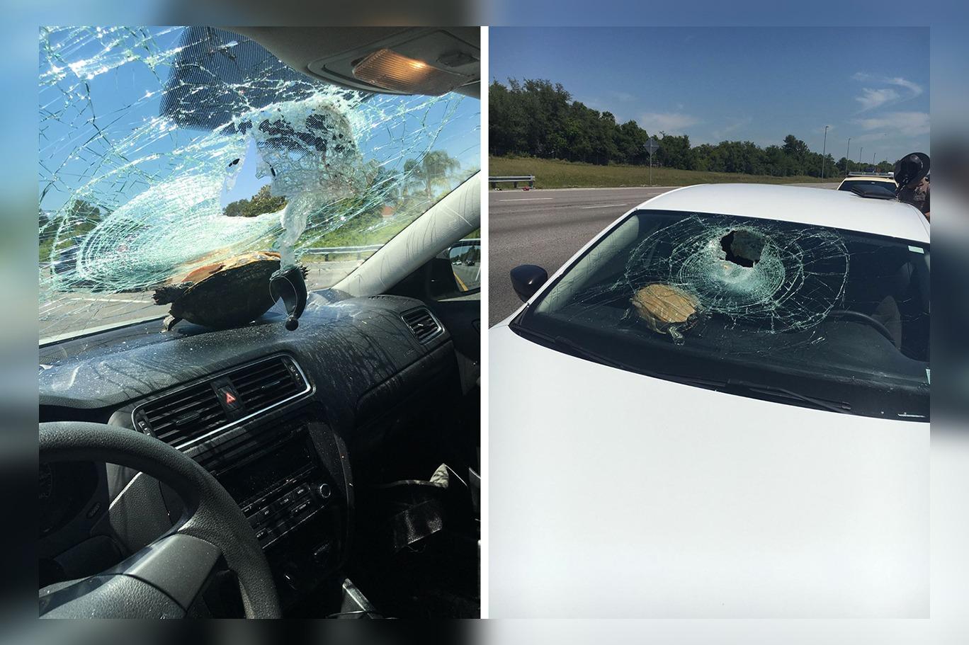 Öte yandan kaplumbağa camı kırıp ön yolcu koltuğundaki 71 yaşındaki annenin kafasına çarptı. Port Orange polisi sözcüsü Andre Fleeming, talihsiz kadının alnında yaklaşık 1,5 santimetrelik bir kesik olduğunu bildirdi.