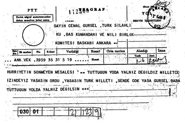 Genelkurmay karargahına binlerce tebrik telgrafı gönderiliyordu. Telgrafın başındaki askerler, darbeyi alkışlayan ve ordunun yönetimi ele geçirmesine sevinenlerin gönderdiği mesajlara yetişmekte zorlanmaya başladı.