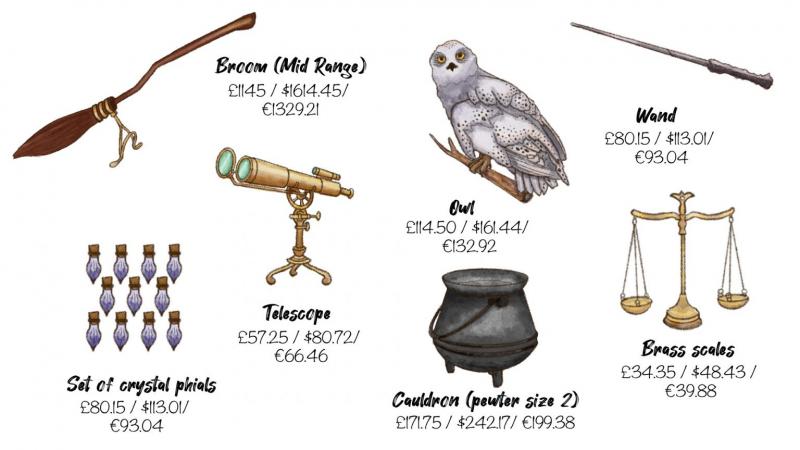 J.K. Rowling'in kaleme aldığı Harry Potter romanlarında kullanılan büyücülük ekipmanları referans alınarak tahmini bir meblağ belirlendi. Hogwarts öğrencilerinin kullandığı malzemeler arasında üniforma, ders araç gereçleri ve kitaplar gibi temel eğitim ihtiyaçları yer alıyor.