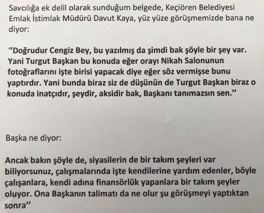 İşadamı Cengiz Peker, işletme hakkına 15 yıllığına sahip olduğu Bengi Royal Nikah ve Düğün Salonu’ndaki fotoğraf ve video işlerinin başka bir isme devredilmesini istediğini öne sürdüğü Keçiören Belediye Başkanı Turgut Altınok hakkında yaptığı suç duyurusuna “yeni bir delil eklediğini” duyurdu.