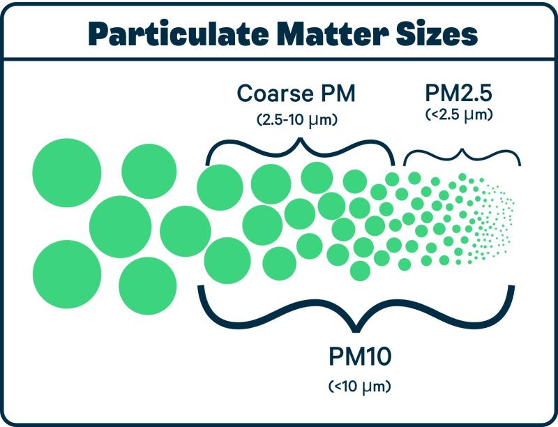 Aerodinamik çapları 10 mikrometrenin altında olan PM10 kirleticileri, saç kılından 5 ila 7 kat daha küçük boyuttadır. Yine aerodinamik çapları 2.5 mikrometrenin altında olan PM2.5 ise 20 ila 28 kat daha küçüktür.