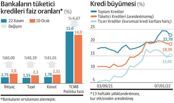 Merkez Bankası'nın indirim sinyali verdiği eylül başında 13 haftalık yıllıklandırılmış kur etkisinden arındırılmış ticari kredi büyümesi yüzde 5,6 seviyesindeyken en fazla artışın gözlendiği hafta 26 Kasım 2021 haftasında yüzde 17,42 olmuştu. Ardından politika faizi indirimleri sürse de ticari kredi büyümesinde gerileme yaşanmaya başladı. Yine Merkez Bankası verilerinden yapılan 13 haftalık yıllıklandırılmış kur etkisinden arındırılmış verilere göre kamu bankalarının kredi büyümesi yüzde 19,04 seviyesinde kalırken özel bankalarda bu oran yüzde 19,70 oldu. Hem özel hem kamuda kredi büyümesinde ivme kaybı yaşandı.