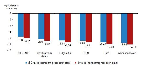 Yİ-ÜFE ile indirgendiğinde; aylık olarak yatırım araçlarından mevduat faizi (brüt) yüzde 8,33, külçe altın yüzde 8,81, Devlet İç Borçlanma Senetleri (DİBS) yüzde 8,88, Euro yüzde 9,45 ve Amerikan doları yüzde 9,62 oranlarında yatırımcısına kaybettirdi. TÜFE ile indirgendiğinde mevduat faizi (brüt) yüzde 8,87, külçe altın yüzde 9,34, DİBS yüzde 9,41, Euro yüzde 9,98 ve Amerikan doları yüzde 10,14 oranlarında yatırımcısına kaybettirdi.
