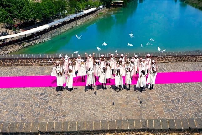Pembe halı üzerinde ürünleri sergileyen mankenler, 50 ülke televizyonunda aynı anda yayımlanacak digital platform için hazırlanan klip sonunda Dicle Nehri üzerindeki On Gözlü Köprü'den beyaz güvercin uçurdular.