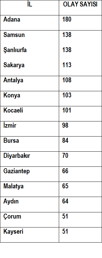 Silahlı şiddette başı 351 olayla İstanbul çekti. Adana'da 180, Samsun ve Şanlıurfa ise 138'er olay meydana geldi.