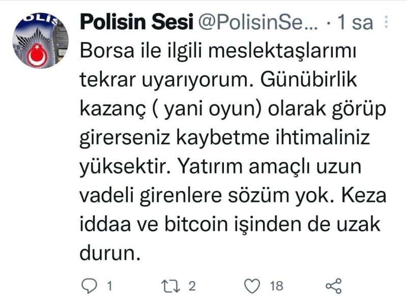 Polis haklarıyla ilgili paylaşımlar yapan "Polisin Sesi" adlı hesaptan 5 Aralık 2022 Pazartesi günü yapılan paylaşımda, "Borsa ile ilgili meslektaşlarımı tekrar uyarıyorum. Günübirlik kazanç (yani oyun) olarak görüp girerseniz kaybetme ihtimaliniz yüksektir. Yatırım amaçlı uzun vadeli girenlere sözüm yok. Keza iddaa ve Bitcoin işinden de uzak durun" denildi.