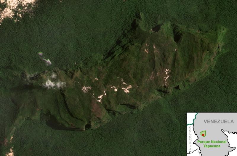 Venezuela'nın Amazon Ormanları kıyısındaki 1345 metre rakımlı düz tepeli dağı Cerro Yapacana'nın her tarafının, koruma bölgesinde olmasına ve yerli halk tarafından kutsal kabul edilmesine rağmen, kaçak altın madenciliği yapan gruplarca oyulduğu belgelendi.