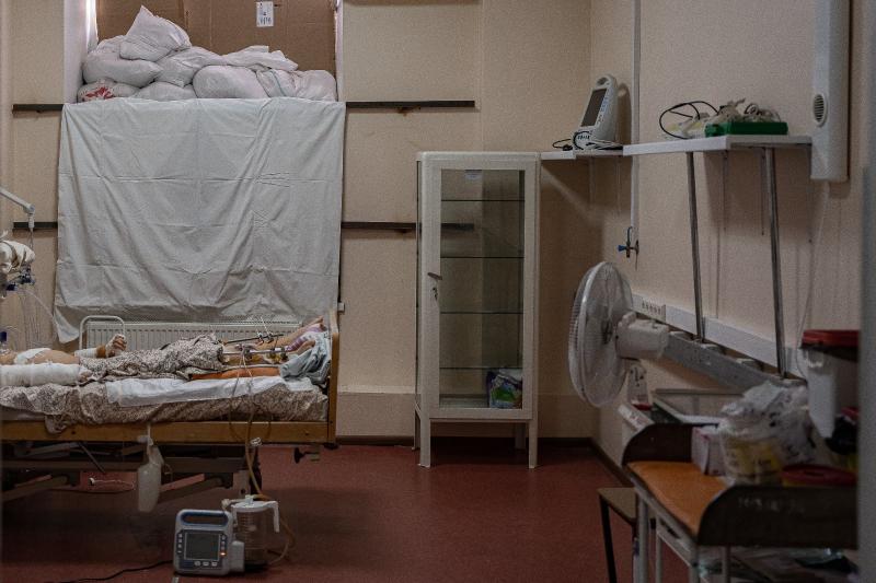 İşgal altındaki topraklardaki bombardımanda yaralanan bir çocuk, Zaporijya'da kum torbasıyla güçlendirilen hastanede tedavi ediliyor (Nisan 2022).