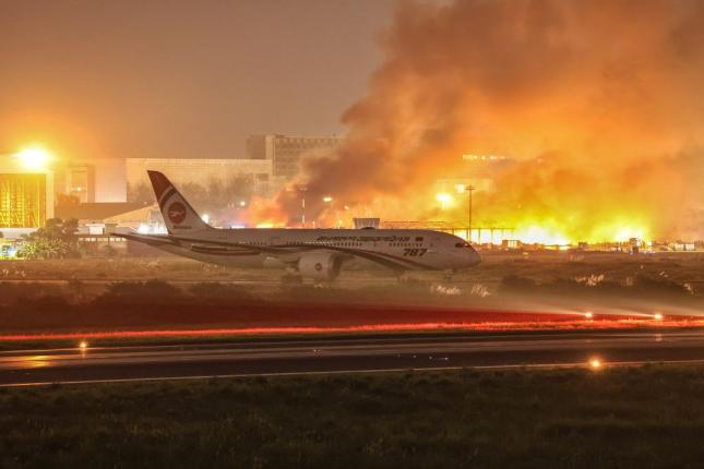 18 Ekim 2025 - Bangladeş'in başkenti Dakka'daki Hazrat Shahjalal Uluslararası Havalimanı'nın kargo bölümünde çıkan yangın söndürülmeye çalışılıyor. Havalimanında bugün çıkan yangın, ana havalimanı terminalini etkilemedi ancak pistte yoğun duman bulutları görüldü. 37 itfaiye birimi yangına müdahale ederken, uçuşların askıya alındığı bildirildi. Yetkililer 4 kişinin hafif yaralandığını ve hastanede tedavi gördüğünü açıkladı. Yangına neyin yol açtığı henüz bilinmiyor. (Maruf Rahman / AFP) -