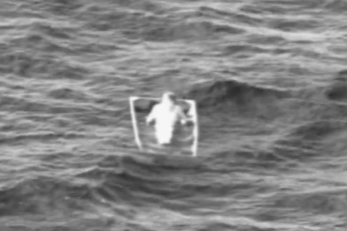 Videoda Gregory, dalgaların arasında sallanan ve su alan teknede çaresizce otururken görülüyor. Yetkililer daha sonra botla adamın yanına gidip onu kurtarıyor.