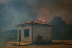 15 Ağustos 2025 - Portekiz'in Trancoso kentindeki Antas köyünde bir video muhabiri, orman yangınından korunmak için siper alıyor. Portekiz'in iç ve kuzey kesimlerindeki 5 büyük yangına müdahaleler sürüyor. Lizbon'un yaklaşık 350 km kuzeydoğusundaki Trancoso'daki yangınsa 6 gündür devam ediyor. Komşu İspanya da şiddetli rüzgarların ve sıcağın etkisiyle 14 büyük yangınla mücadele ederken, 7 kişinin hayatını kaybettiği ve Londra büyüklüğünde bir alanın yandığı bildirildi. (Patrícia de Melo Moreira/AFP) -