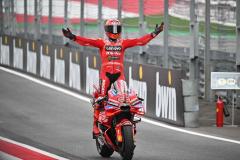 17 Ağustos 2025 - Ducati Lenovo takımının İspanyol sürücüsü Marc Marquez, Avusturya'nın Spielberg kentindeki Red Bull Ring yarış pistinde düzenlenen MotoGP Avusturya Grand Prix'sini kazandıktan sonra kutlama yapıyor. Motosiklet yarışlarının en önemli organizasyonunda sezonun 13. etabı, 4,3 kilometrelik Red Bull Ring'de, 28 tur üzerinden düzenlendi. MotoGP'de 6 kez şampiyonluk yaşayan Marquez, bitiş çizgisini 42 dakika, 11 saniyelik süresiyle birinci sırada geçerek üst üste 6, sezonun 9. zaferine ulaştı. Tecrübeli pilot, MotoGP tarihinin 1000. yarışından zaferle ayrıldı. BK8 Gresini takımından İspanyol Fermin Aldeguer, liderin 1.118 saniye gerisinde ikinci, Aprilia ekibinin İtalyan pilotu Marco Bezzecchi ise Marquez'in 3.426 saniye arkasında üçüncü sırayı aldı. Sezonun 14. yarışı Macaristan Grand Prix'si, 24 Ağustos'ta yapılacak. (Jure Makovec/AFP) -