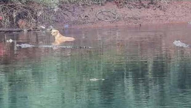 Bir grup timsah tehlikeli nehre düşen köpeği güvenli bir yere yönlendirir gibi görünerek türler arası merhamet örneği sergiledi.