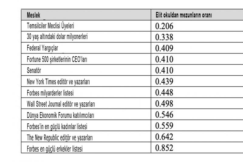 Journal of Expertise’te 2018’de yayımlanan araştırma, New York Times’ın editoryal kadrosunun yüzde 44’ünün elit bir üniversiteden mezun olduğunu ortaya koydu. Bu oran Wall Street Journal’daysa neredeyse toplamın yarısı kadar. Bu gazetelerdeki muhabirlerin ve editörlerin Forbes milyarderleri ve Davos katılımcıları gibi elit bir eğitime sahip olma ihtimali yüksek. Bu okullardan mezun olmaları senatörlerden, Kongre üyelerinden ve yargıçlardan daha olası.
