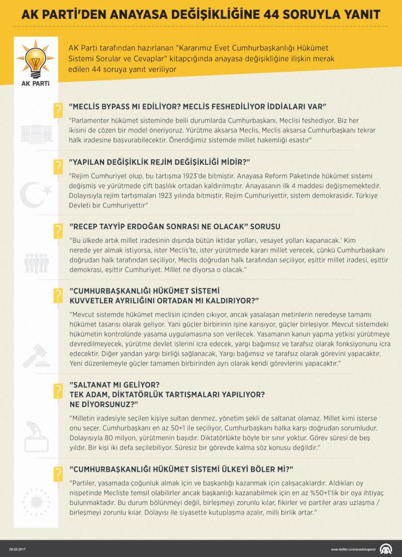 2017'de AK Parti adına MHP ile yapılan anayasa görüşmelerini yürüten dönemin AK Parti Genel Sekreteri Abdulhamit Gül'ün hazırladığı "Kararımız Evet Cumhurbaşkanlığı Hükümet Sistemi Sorular ve Cevaplar" kitapçığında anayasa değişikliğine ilişkin merak edilen 44 soruya yanıt verilmişti.