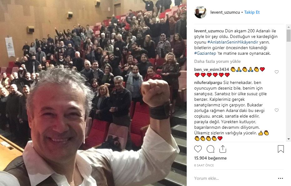 Öte yandan, geçtiğimiz günlerde tiyatro sanatçısı Levent Üzümcü, 10 Ocak'ta Hatay İskenderun'da sergileyeceği "Anlatılan Senin Hikâyendir” adlı oyunu baskılar nedeniyle iptal etmek zorunda kaldıklarını belirterek, fahri üyesi olduğu Oyuncular Sendikası'ndan istifa ettiğini duyurmuştu.