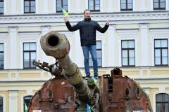 28 Ekim 2025 - Ukrayna bayrağı tutan bir adam, Kiev'de düzenlenen imha edilmiş Rus teçhizatı açık hava sergisinde Rus askeri aracının üzerinde. Ukrayna Devlet Başkanı Volodimir Zelenski, ABD, İsveç ve Fransa'dan F-16, Gripen ve Rafale gibi 250 savaş uçağı almak için çalışmaları sürdürdüklerini söyledi. Rus ordusunun ülkesine yönelik hava saldırılarını sürdürdüğünü ifade eden Zelenski, hava savunma imkanlarını artırmak için çalıştıklarını belirtti. Rusya Dışişleri Bakanı Sergey Lavrov, Rusya Devlet Başkanı Vladimir Putin ve ABD Başkanı Donald Trump arasında yeniden zirve yapılmasının ABD'ye bağlı olduğunu belirterek, "Amerikalıların rahat edeceği bir tempoda ilerlemeye hazırız" dedi. (Sergei Supinsky/AFP) -