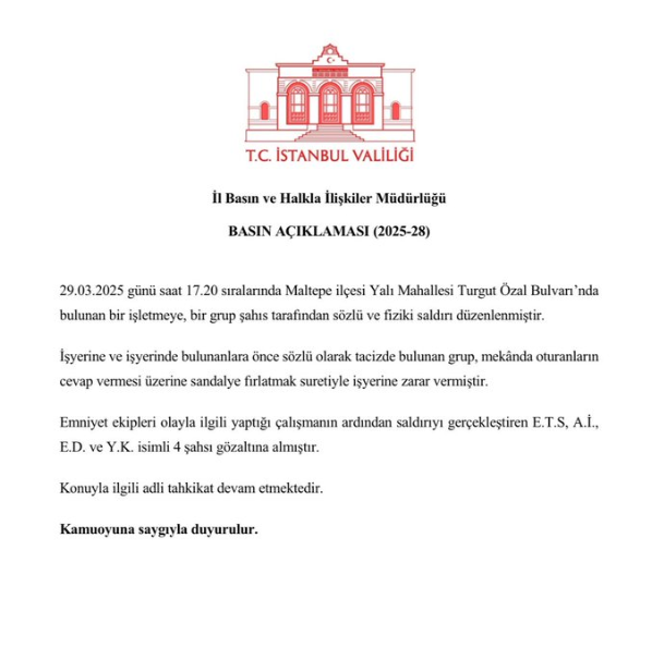 29.03.2025 günü saat 17.20 sıralarında Maltepe ilçesi Yalı Mahallesi Turgut Özal Bulvarı’nda bulunan bir işletmeye, bir grup şahıs tarafından sözlü ve fiziki saldırı düzenlenmiştir. İşyerine ve işyerinde bulunanlara önce sözlü olarak tacizde bulunan grup, mekânda oturanların cevap vermesi üzerine sandalye fırlatmak suretiyle işyerine zarar vermiştir. Emniyet ekipleri olayla ilgili yaptığı çalışmanın ardından saldırıyı gerçekleştiren E.T.S, A.İ., E.D. ve Y.K. isimli 4 şahsı gözaltına almıştır. Konuyla ilgili adli tahkikat devam etmektedir. Kamuoyuna saygıyla duyurulur.