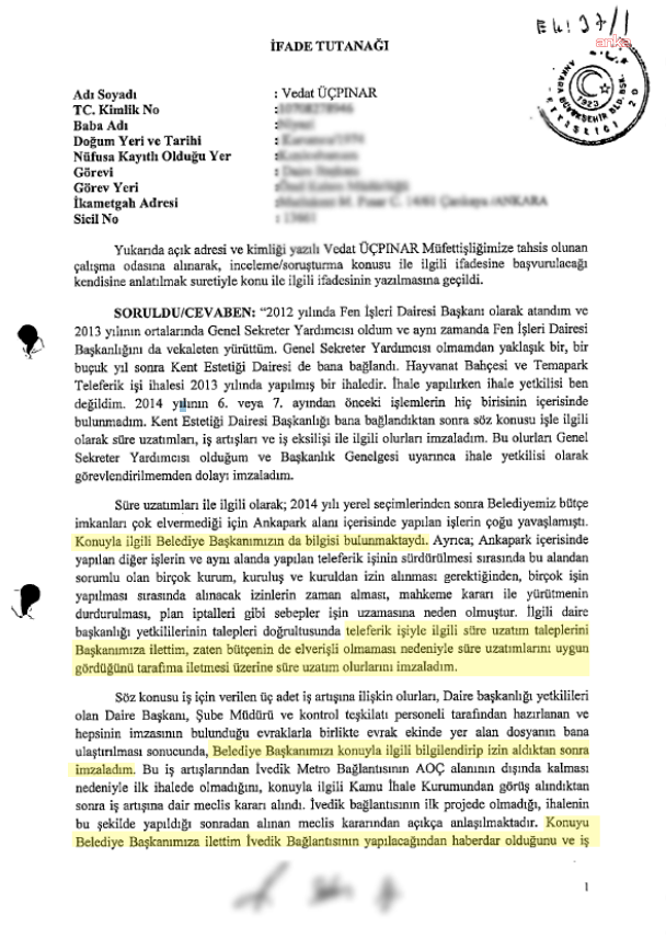 ABB yönetimi, ihaleyle ilgili geriye dönük inceleme gerçekleştirdi. Teftiş Kurulu raporunda, belediye başkanının bilgisi olmadan ödeme onayı alınamayacağı vurgulanırken dosyadaki ifadelerde dönemin Başkanı Gökçek’in sürece "tam bilgi ve sorumlulukla dahil olduğu" yer aldı. Gökçek döneminde Genel Sekreter Yardımcısı olan ve Fen İşleri Daire Başkanlığı görevini yürüten Vedat Üçpınar, müfettişlere verdiği ifadede, "teleferik projesindeki iş artışlarının Gökçek’in bilgisi ve talimatı ile yapıldığını" söyledi. Üçpınar ifadesinde, "Konuyla ilgili Belediye Başkanımızın da bilgisi bulunmaktadır. Belediye Başkanımıza ilettim, bütçenin elverişli olmaması nedeniyle süre uzatımlarını uygun gördüğünü tarafıma iletmesi üzerine onayladım” ifadelerini kullandı.