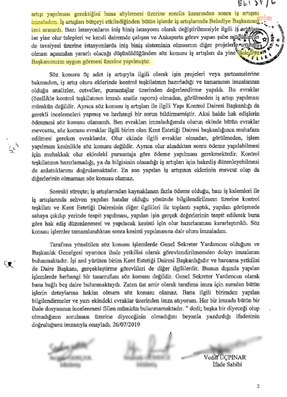 Üçpınar, iş artışlarını dönemin başkanı Melih Gökçek’in bilgisi dahilinde imzaladığını söyledi. Ancak yapılan suç duyurusu işleme alınmadı.
