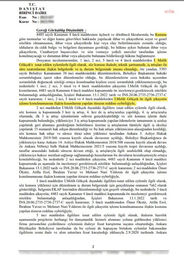 ABB'nin, Gökçek ve dosyada adı geçen diğer şüpheliler hakkındaki şikayeti işleme konulmadı. Bunun üzerine ABB, şikayetin işleme konulmamasını Danıştay'a taşıdı. Danıştay Birinci Dairesi tarafından incelenen dosya belediyenin aleyhine karara bağlandı. Danıştay Birinci Dairesi, "Melih Gökçek’in bilgisi olmasına rağmen belgelerde imzası olmadığı" gerekçesiyle belediyenin talebini reddetti.