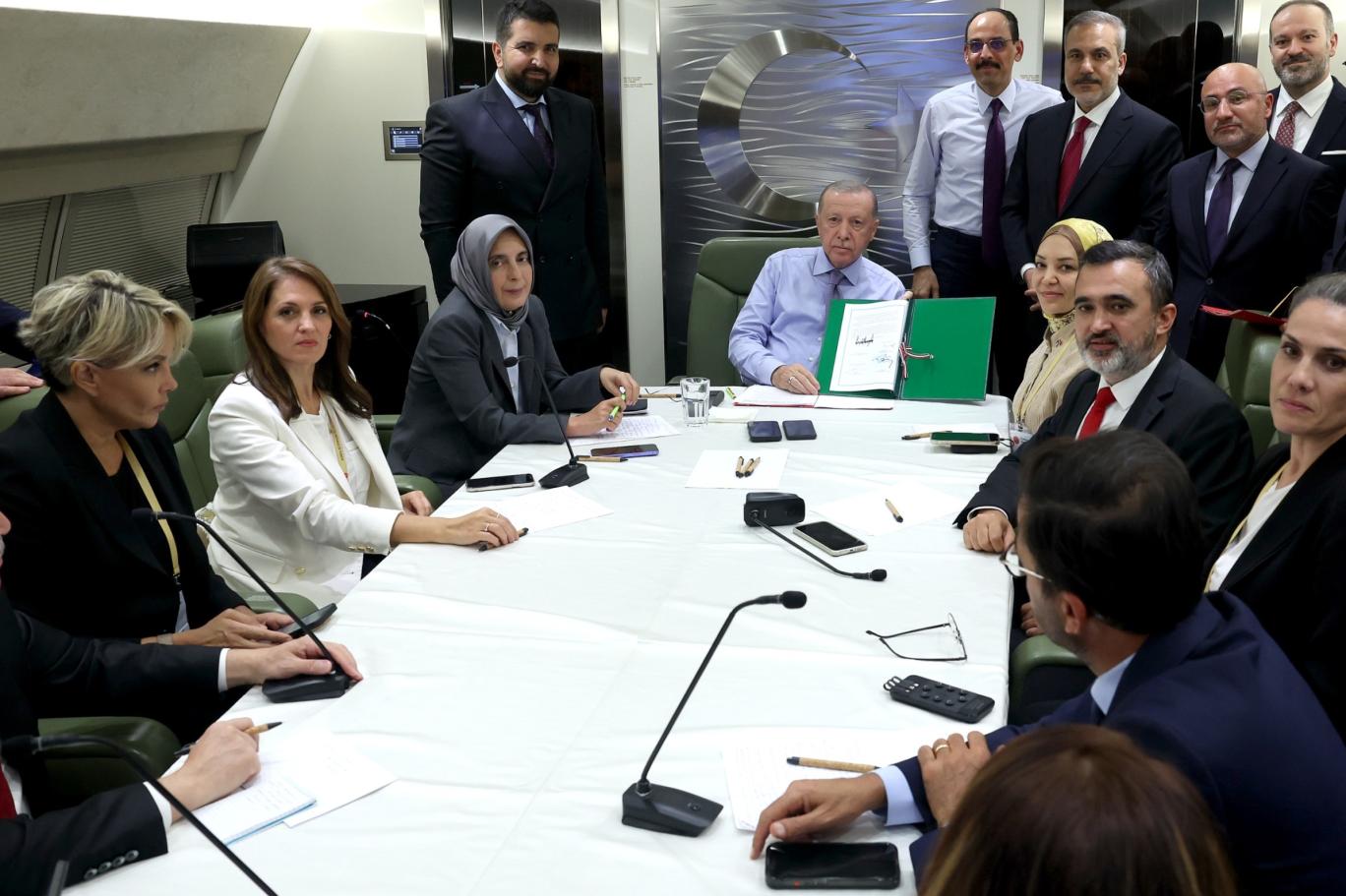 Uçakta gazetecilerin sorularını cevaplayan Erdoğan, "Dışişleri Bakanımız Hakan Fidan, Milli Savunma Bakanımız Yaşar Güler, MİT Başkanımız İbrahim Kalın başta olmak üzere arkadaşlarımız muhataplarıyla görüşecek. Ben de liderlerle temas halinde olacağım. “Bu süreci nasıl işletebiliriz?” bunun üzerinde duracağız" dedi.