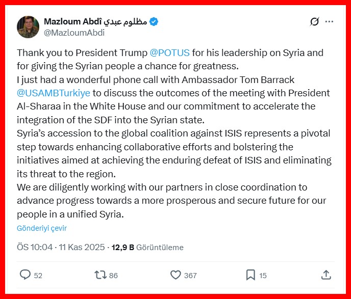 Beyaz Saray’da Cumhurbaşkanı El Şara ile yapılan toplantının sonuçlarını ve SDG’nin Suriye devletine entegrasyonunu hızlandırma taahhüdünü görüşmek üzere Büyükelçi Tom Barrack ile harika bir telefon görüşmesi yaptım. Suriye’nin IŞİD’e karşı küresel koalisyona katılımı, işbirliği çabalarını artırma, IŞİD’in kalıcı yenilgisini sağlama ve bölgeye yönelik tehdidini ortadan kaldırmayı amaçlayan girişimleri destekleme yolunda önemli bir adım teşkil ediyor. Birleşik bir Suriye’de halkımız için daha müreffeh ve güvenli bir geleceğe doğru ilerlemek için ortaklarımızla yakın koordinasyon içinde özenle çalışıyoruz.