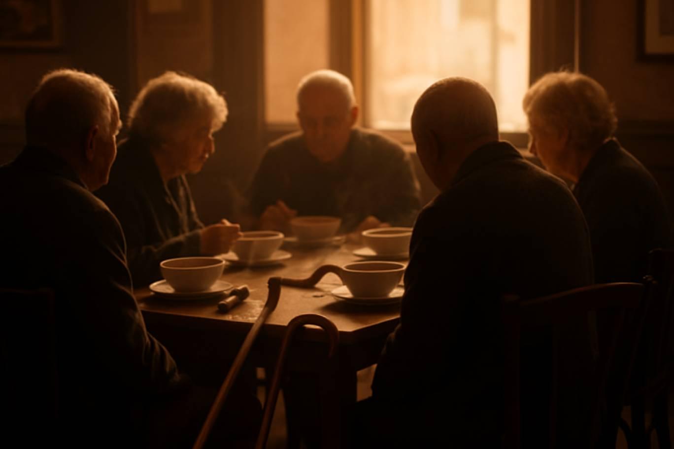 Masaya oturduğumuzda, garson paltolarımızı asmak için değil, dördümüzün dayandığı bastonları almaya geldi.