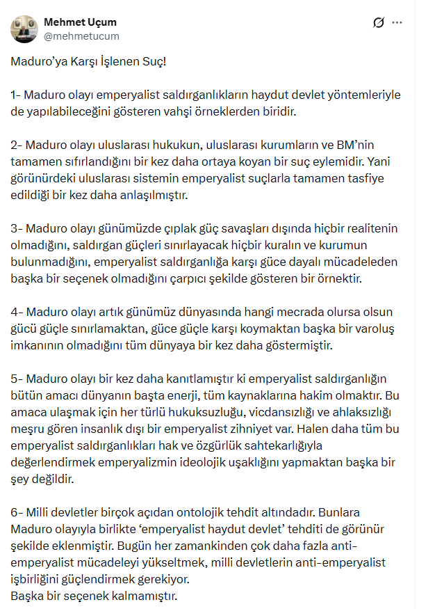 Sosyal medya hesabından yaptığı değerlendirmede Uçum, Maduro olayının uluslararası hukukun, uluslararası kurumların ve Birleşmiş Milletler’in fiilen devre dışı bırakıldığını bir kez daha gözler önüne serdiğini ifade etti. Görünürde var olan uluslararası sistemin, emperyalist suçlar karşısında tamamen tasfiye edildiğini savunan Uçum, günümüz dünyasında çıplak güç savaşları dışında bağlayıcı bir gerçekliğin kalmadığını belirtti.