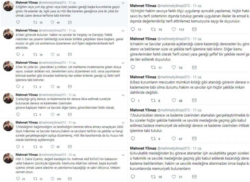 Hesabından 10 mesaj paylaşan Yılmaz, ‘ilk mesajında 2802 Sayılı Hâkimler ve Savcılar Kanunu’nun ,hakim ve savcı terfilerinin ne şekilde ve hangi sürede yapılacağını düzenlediğini, HSK ilke kararlarında da bu hususun net olarak belirlenip açıklandığını’ ifade etti.