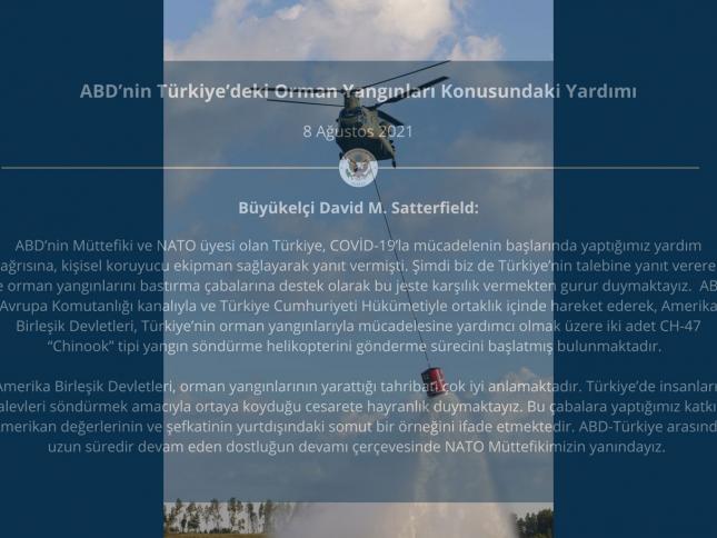 Dünya ABD'den Türkiye'nin Kovid-19 yardımına karşı jest: 2 yangın söndürme helikopteri gönderilecek ABD, Türkiye'deki yangınlara müdahale etmek için iki adet CH-47 Chinook tipi yangın söndürme helikopteri göndereceğini duyurdu Erdoğan: Yangın bölgelerinde "uçak ve helikopterler yok" diye yalan terörü estiriliyor Erdoğan’dan orman yangınlarında Türkiye’ye yardımcı olan ülkelere teşekkür Savcılıktan "Help Turkey" etiketiyle yapılan paylaşımlara soruşturma